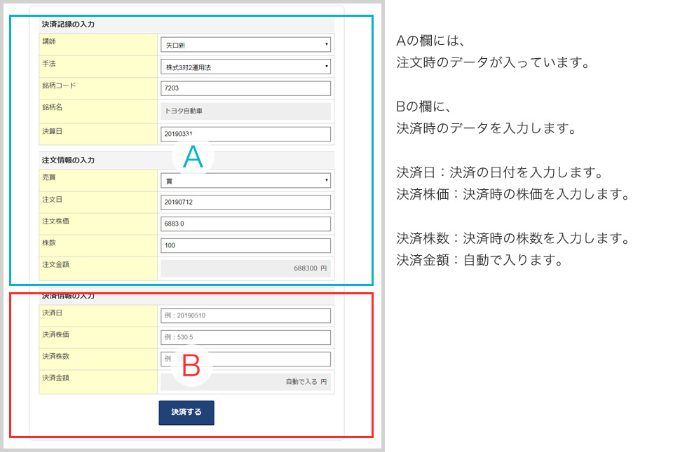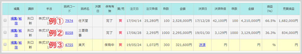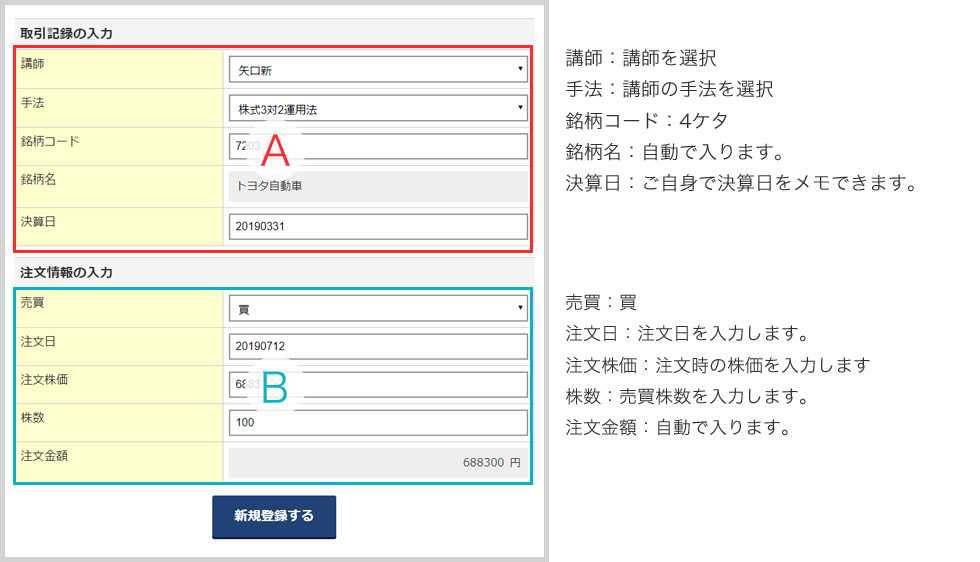 講師、手法、取引した銘柄コード、決算発表日を手動で入力します。